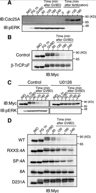 Figure 5. ERK pathway-dependent degradation of Xe-Cdc25A during oocyte maturation. (A) Immature oocytes (IMO) were treated with progesterone (PG) to induce maturation, whereas ovulated eggs were fertilized in vitro. Maturing oocytes and fertilized eggs were collected at the indicated times, and analyzed for endogenous Xe-Cdc25A and phospho-ERK by immunoblotting. GVBD denotes germinal vesicle breakdown. (B) Immature oocytes were coinjected with 2 ng of Myc-Xe-Cdc25A mRNA and 20 ng of either GST mRNA (Control) or β-TrCPÎF mRNA, cultured overnight, treated with progesterone, and analyzed for Myc-Xe-Cdc25A by immunoblotting. (C) Immature oocytes were injected with 2 ng of Myc-Xe-Cdc25A mRNA, cultured overnight, pretreated with dimethyl sulfoxide (Control) or 100 μM U0126 for 1 h, treated with progesterone, and analyzed for Myc-Xe-Cdc25A and phospho-ERK by immunoblotting. (D) Immature oocytes were injected with 2 ng of mRNA encoding the indicated Myc-Xe-Cdc25A constructs, cultured overnight, treated with progesterone, and analyzed for Myc-Xe-Cdc25A constructs by immunoblotting. In BâD, all the Myc-Xe-Cdc25A constructs were, in fact, phosphatase-dead C428S forms to avoid premature maturation of the oocytes. Four, three, four, and five independent experiments were performed for A, B, C, and D, respectively, and, for each, a typical result is shown.