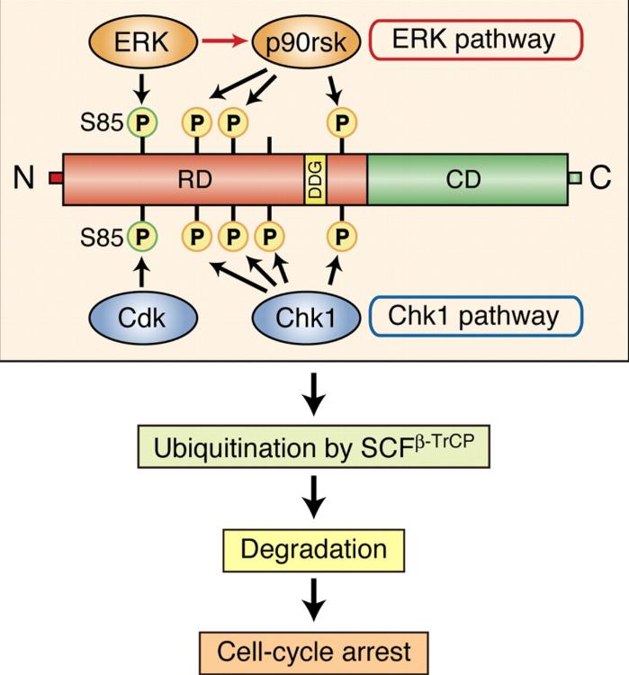 The extracellular signal-regulated kinase-mitogen-activated protein kinase pathway phosphorylates and targets Cdc25A for SCF beta-TrCP-dependent degradation for cell cycle arrest.
