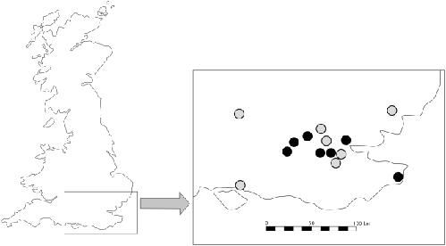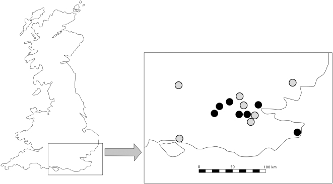 Figure 1. Map Showing the Location of Study Sites in England.Infected (Rv+) populations are indicated by black circles, and uninfected (Rv−) by grey circles.