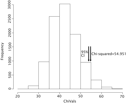 Figure 3. Distribution of Chi-squared Values Generated by Randomizing Disease Status.The chi-squared value obtained from empirical data is marked with an arrow, together with the 95% confidence limit.