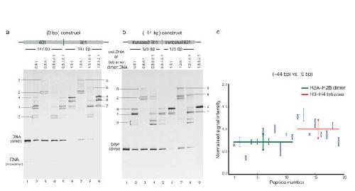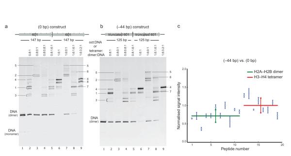 Figure 2. Measuring the histone content of dimeric chromatin particlesa+b, Reconstitution and native-gel analysis. Reconstitutions were performed at the indicated [octamer]:[DNA] and [tetramer]:[dimer]:[DNA] ratios and analyzed by means of native-gel electrophoresis. Assembly was performed on a the (0bp) and b the(-44bp) construct. Each intermediate in assembly is labeled for a full description see text and Supplementary Figure 2. 1, mononucleosomes; 2, monotetrasomes; 3, monohexasomes; 4, fully assembled species; 5, ditetrasome; 6, tetrasome-hexasome; 7 dihexasome; 8 hexasome-nucleosome. c, The major fully assembled species (i.e. bands 4 in a+b) were purified by native-gel electrophoresis, digested with trypsin and analysed in triplicate by LC/ESI/MS/MS. Signal intensities of peptides in the (-44bp) samples were divided by the corresponding signal intensities in the (0bp) samples and the average over all replicates was calculated for each individual peptide (blue diamonds). Then these averaged normalized signal intensities were averaged separately for dimer-derived (green) and tetramer-derived (red) peptides yielding a [dimer]:[tetramer] ratio of 0.72. Standard deviations are shown as error bars.