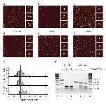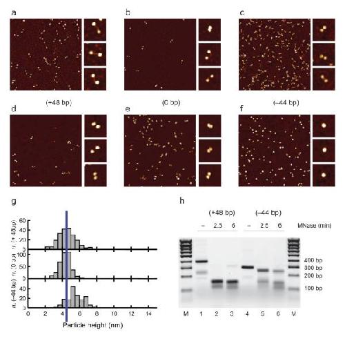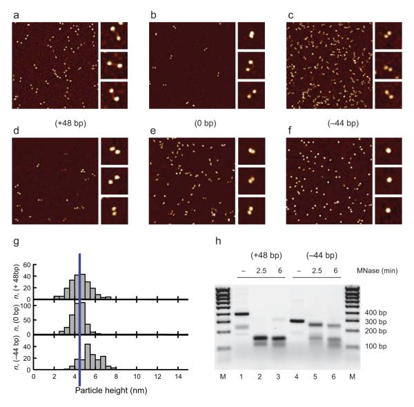 Figure 3. AFM imaging of dinucleosomesa-f, Dinucleosomes on the respective constructs were gel-purified, fixed in the absence (a-c) or presence (d-f) of 5 mM Mg2+ and imaged. In the presence of divalent cations the overlapping dinucleosomes on the (-44bp) construct appear as single particles of increased height. g, Maximal heights of the particles in the experiments in d-f. The average height of the nucleosomes on the (+48bp) and (0bp) constructs is indicated by the blue vertical line. h, Dinucleosomes on the (+48bp) (lanes 1-3) and (-44bp) (lanes 4-6) constructs were treated with MNase for the indicated amounts of time. An MNase resistant fragment of around 250 bp is observed for the dinucleosomes on the (-44bp) construct.