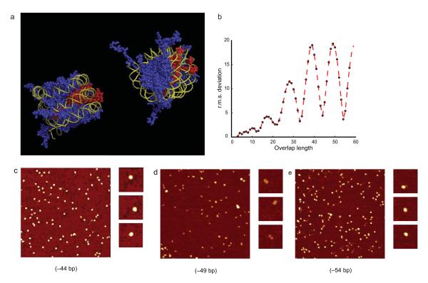 Figure 4. Helical phasing is required for the condensation of overlapping dinucleosomesStructural models of dinucleosomes on the (-44bp) construct in the unfolded (left) and folded (right) states (a).. The exposed inner dimer on the complete nucleosome is highlighted red. Other histone proteins are shown in blue and DNA in yellow. b, A plot of the root mean square deviation (RMSD) of phosphorus atoms as a function of the overlap length for partial superimposition of two copies of the DNA superhelix in 1KX5. For a chosen overlap length n the last n base pairs in the first copy were superimposed with the first n base pairs in the second copy. The helical periodicity suggests that formation of compact structures is likely to require helical phasing. c-e, AFM imaging of dinucleosomes with overlaps lengths of -44, -49 and -54 bp following fixation in 5 mM Mg2+. Formation of compact particles is observed for the (-44bp) and (-54bp) constructs that coincide with minima in a, unfolded particles predominate for the -49bp construct.