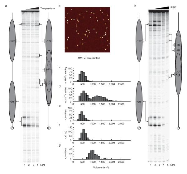Figure 5. Formation of overlapping nucleosomes as a result of repositioninga, Samples of a dinucleosomal reconstitution on the MMTV were incubated at 0, 42, 47 or 52 °C for 60 min and analyzed by site-directed mapping. Mapping signals are labeled with the respective dyad positions. b, Dinucleosomes were gel-purified, temperature-treated and fixed in the presence of 5 mM Mg2+ followed by AFM imaging at room temperature. c-g, Volumetric analysis of particles on the MMTV fragment before (c) and following (d) temperature incubation and on the three 601 constructs in the presence of Mg2+. Where two particles could be resolved on a template molecule their volumes were determined and scored separately. Where only one large particle was present the total volume of the composite particle was used. h 2 pMoles of Dinucleosomes assembled on MMTV DNA were subject to remodeling with 0, .015, .03, 0.6, .012 fmoles RSC in the presence of 1mM ATP from 30 min at 30°C. Following remodeling the major new locations detected are consistent with nucleosomes moving into locations in which their DNA territories overlap. The loss of mapping signal in lanes 4 and 5 may be due to the increased heterogeneity in the remodeled chromatin and or additional alterations to chromatin structure.