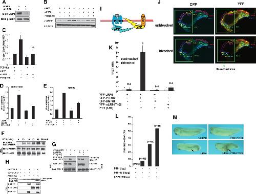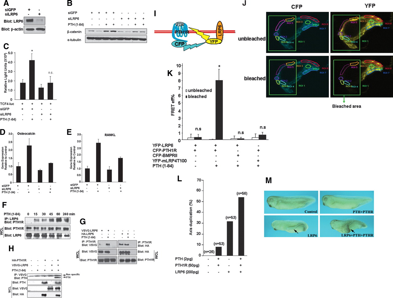 Formation of complexes of LRP6 with PTHâPTH1R. (A) LRP6-specific siRNA reduced the amount of LRP6 protein in HEK 293 cells as determined by Western blotting. siRNA directed against GFP was used as an siRNA control. (B) LRP6-specific siRNA reduced PTH-induced β-catenin stabilization in HEK293 cells as determined by Western blotting analysis. (C) LRP6-specific siRNA reduced PTH-stimulated TCF/LEF activity in UMR-106 cells as determined using a luciferase assay. (*) P < 0.01 (in comparison with control), n = 3; (n.s.) not significant (in comparison with control), n = 3. (D,E) Real-time PCR analysis of Osteocalcin (D) and RANKL (E) mRNA expression. C2C12 cells expressing siGFP (control) or siLRP6 together with PTH1R were treated with or without PTH (1â34) in osteogenic induction medium (100 nM ascorbic acid, 10 mM glycerophosphate, and 100 ng/mL BMP2) and harvested at day 3 for RNA extraction. (F) Co-IP of endogenous LRP6 with PTH1R in UMR-106 cells. Cells were serum deprived and treated with 10â8 M PTH (1â84). The LRP6-associated PTH1R was determined separately by Western blotting of the anti-LRP6 immunoprecipitates. (WCL) Whole-cell lysates. (G) PTH enhances binding of PTH1R to LRP6, but not LRP5. HEK 293 cells were transfected with VSVG-tagged LRP6 or HA-LRP5 together with PTH1R and treated with 10â8 M PTH (1â84). The PTH1R-associated LRP5 or LRP6 was determined by Western blotting analysis of the anti-PTH1R immunoprecipitates. (WCL) Whole cell lysates. (H) Ternary complex of LRP6, PTH, and PTH1R. HEK 293 cells were transfected with VSVG-tagged LRP6 and HA-PTH1R and treated with 10â8 M PTH (1â84). The LRP6-associated PTH ligand was determined by Western blotting analysis of the anti-VSVG immunoprecipitates. (WCL) Whole cell lysates. (IâK) PTH brings PTH1R and LRP6 into close proximity as demonstrated by FRET. (I) A photobleaching-based FRET (pbFRET) system was generated by transiently expressing two constructs in HEK293 cells in which CFP and YFP were fused at the C terminus of PTH1R and LRP6, respectively. The interactions of YFP-fused LRP6 with CFP-fused BMPRII or CFP-fused PTH1R with YFP-fused mLRP4T100 were also examined as controls. (J) Representative confocal imaging of the association of CFP-PTH1R with YFP-LRP6 at 5 min after PTH treatment in HEK293 cells by pbFRET. The total photobleached area (ROI_1) is marked with a green square. Quantification of fluorescent intensities of each chosen point within (ROI_2â¼ROI_6) or outside of the marked bleached area (ROI_7â¼ROI_9) by averaging fluorescence before and after the bleach was conducted. (K) Comparison of the FRET efficiencies (FRET Eff%) before and after photobleaching in the absence or presence of PTH. (*) P < 0.001, compare with unbleached, n = 6; (n.s.) not significant compare with unbleached. (L,M) Ventral injection of RNA for PTH (2 pg) plus PTH1R (50 pg) promotes LRP6 (200 pg)-induced axis duplication. (n) Numbers of embryos scored.