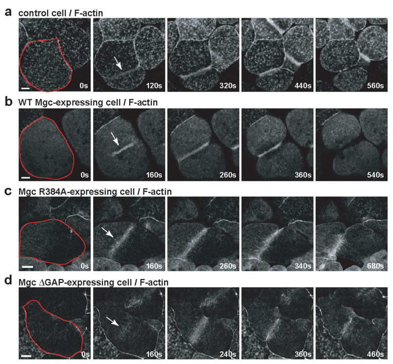 Figure 3. Downstream consequences of abnormal GTPase fluxa–d, Embryos were injected with GFP-UtrCH to monitor F-actin along with WT Mgc (b), Mgc R384A (c), or Mgc ΔGAP (d) and imaged during cytokinesis. Frames taken from time-lapse movies are shown. A single blastomere is outlined in red in the first frame, and the Rho activity zone is marked with an arrow in the second frame. Scale bars, 40 μm.