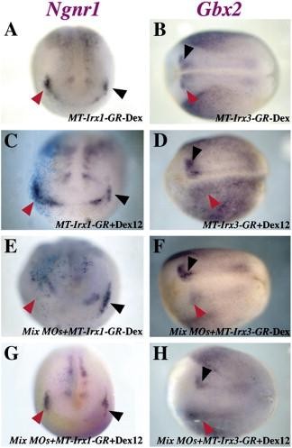 Fig. 4. Rescue of Irx MOs defects. All embryos are at stage 14â16. (A, C, E and G) are anterior and (B, D, F, H) are dorsal views, respectively. Black and red arrowheads point at control and injected sides, respectively. Embryos injected with MT-Irx1-GR (A, C, E, G) or MT-Irx3-GR (B, D, F, H) mRNAs alone (AâD) or with a mix of Irx MOs (EâH). (AâD) In the presence of Dexamethasone, the injected mRNAs caused expansion of Ngnr1 (C) and Gbx2 (D). This is not observed in the absence of the hormone (A, B). (EâH) In embryos co-injected with MT-Irx-GR mRNA and Irx MOs, in the absence of Dex, Ngnr1 (E) and Gbx2 (F) are downregulated. (G, H) This phenotype is rescued in the presence of Dex. |