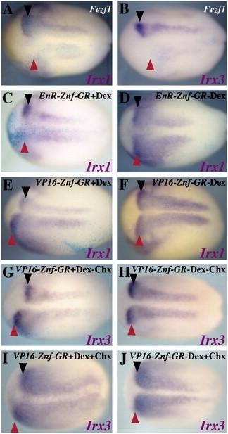 Fig. 5. Fezf represses Irx genes. All embryos are dorsal views at stage 14â15. Black and red arrowheads point at the control or injected side, respectively. (A, B) In embryos injected with Fezf1 mRNA Irx1 (A) and Irx3 (B) are downregulated. (C, D) Injection of EnR-Znf-GR mRNA caused similar Irx1 downregulation in the presence of Dex (C) but not in its absence (D). (E, F) Injection of VP16-Znf-GR mRNA caused anterior Irx1 expansion in the presence of Dex (E) but not in the absence of the hormone (F). (GâJ) Irx3 is also activated by VP16-Znf-GR mRNA even in the presence of cycloheximide. |