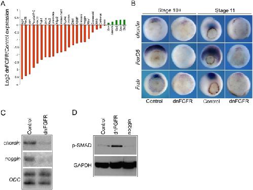 Figure 4. FGF signaling and regulation of dorsal gene expression.(A) is a bar chart showing the log2 of the ratio of expression dnFGFR4 injected embryos versus control embryos for a number of dorsally expressed genes at gastrula stage 10.5. Microarray derived expression values are based on the average of three biological replicates. Bars in red below the centre line represents genes down regulated in response to FGF inhibition. Bars in green represent genes up regulated in response to FGF inhibition. (B) shows whole mount in situ hybridizations for chordin, FoxD5 and Frzb in control embryos and embryos injected with 4 ng dnFGF4 mRNA at very early gastrula stage 10+ and mid-gastrula stage 11. All embryos are vegetal views with dorsal to the top. (C) is an RPA showing the expression of chordin and noggin in control embryos and embryos injected with 4 ng dnFGFR1 mRNA at gastrula stage 10.5. (D) is a Western blot showing levels of phospho-SMAD1/5/8 (p-SMAD) at gastrula stage 10.5 in control embryos, embryos injected with 4 ng dnFGFR1 mRNA or 1 ng mRNA coding for secreted the BMP inhibitor noggin. GAPDH is a loading control. |