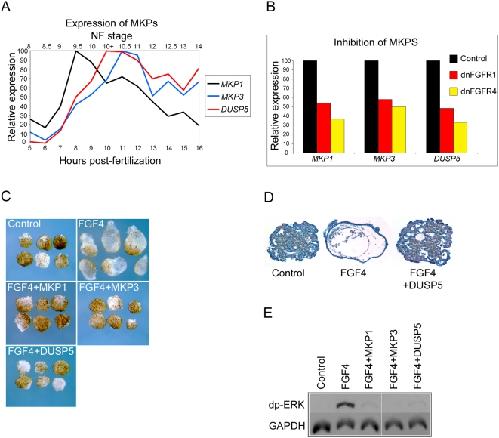 Figure 6. MKPs and FGF signalling.(A) shows the temporal expression profiles of MKP1, MKP3 and DUSP5 from blastula stage 8 until early neurula stage 14 (5 to 16 hours pf at 23°C). Profiles are derived from normalised microarray expression levels. Relative expression values are represented as percentages of the maximum expression value for each gene. (B) is a chart showing the expression of MKP1. MKP3 and DUSP5 in control embryos and embryos injected with 4 ng dnFGFR1 mRNA or 4 ng dnFGFR4 mRNA. Microarray derived expression values are based on the average of three biological replicates. Relative expression is calculated a percentage of the expression in control embryos. Experiments in (C, D and E) were carried out on animal cap explants removed from blastula stage 8 embryos. In all cases control explants are from uninjected embryos, FGF4 treatment was with 10 units of recombinant protein and mRNA injections were with 10 ng MKP1, MKP3 or DUSP5. (C) shows the morphology of animal cap explants at tailbud stage 41. (D) shows 10 µm histological sections of animal cap explants at stage 41. (E) is a Western blot showing levels of dp-ERK and the loading control GAPDH in animal cap explants at stage 10.5. |