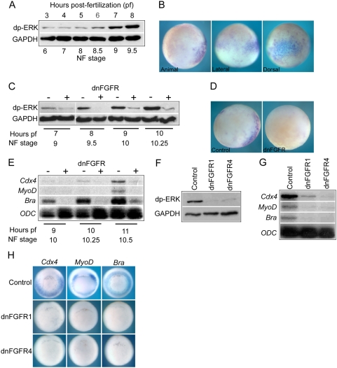 Figure 1. FGF signaling in early development.(A) is a Western blot showing levels of diphospo-ERK (dp-ERK) in whole embryos from cleavage stage 6 to late blastula stage 9.5 (3 to 8 hours pf at 23°C). GAPDH is a ubiquously expressed loading control. (B) shows whole mount immunohistochemistry for dp-ERK in blastula stage 9 embryos. In animal hemisphere view dorsal side is to the right. In lateral view the animal hemisphere is to the top and the dorsal side is to the right. In dorsal view the animal hemisphere is to the top. (C) is a Western blot comparing dp-ERK levels in control uninjected embryos and embryos injected with 4 ng dnFGFR4 mRNA from blastula stage 9 to early gastrula stage 10.25. (D) shows whole mount immunohistochemistry for dp-ERK at blastula stage 9 in a control uninjected embryo and an embryo injected with 4 ng dnFGFR4 embryo. Embryos are viewed from the animal hemisphere with dorsal side to the right. (E) is an RNAase protection analysis (RPA) showing the expression of Cdx4, MyoD, brachyury and ODC in control uninjected embryos and embryos injected with 4 ng dnFGFR4 mRNA from early gastrula stage 10 until stage 10.5. ODC is a ubiquioulsy expressed loading control. 10 µg of total RNA were used per hybridization. (F) is a Western blot showing dp-ERK levels in control uninjected embryos, embryos injected with 4 ng dnFGFR1 mRNA and embryos injected with 4 ng dnFGFR4 mRNA at early gastrula stage 10.5. The embryos are siblings to one set of the three biological replicates used for the microarray analysis. (G) is an RPA showing expression of Cdx4, MyoD and brachyury in control uninjected embryos, embryos injected with 4 ng dnFGFR1 mRNA and embryos injected with 4 ng dnFGFR4 mRNA at early gastrula stage 10.5. The embryos are siblings to one set of the three biological replicates used for the microarray analysis. (H) shows whole mount in situ hybridizations for Cdx4, MyoD and brachyury in control uninjected embryos , embryos injected with 4 ng dnFGFR1 mRNA and embryos injected with 4 ng dnFGFR4 mRNA at early gastrula stage 10.5. The embryos are siblings to one set of the three biological replicates used for the microarray analysis. |