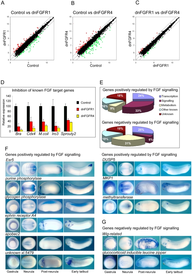Figure 2. Identification of FGF target genes.(A, B and C) are scatterplots of log2 probeset expression values from the Affymetrix microanalysis undertaken on early gastrula stage 10.5 control embryos, dnFGFR1 injected embryos and dnFGFR4 injected embryos . Values for each point are the average of three biological replicates. The centre line represents a ratio of 1â¶1 between the two groups indicating no difference in expression. The outlying lines represent two fold differences in expression. Points representing probe sets showing â¥2 reduction in expression are indicated in green. Points representing probesets showing â¥2 increase in expression are indicated in red. (D) is a chart showing the expression of brachyury (bra), cdx4, marginal coil (M.coil), Iro3 and sprouty2 in control embryos and embryos injected with 4 ng dnFGFR1 mRNA or 4 ng dnFGFR4 mRNA. Microarray derived expression values are based on the average of three biological replicates. Relative expression is calculated as a percentage of the expression in control embryos. Standard deviation bars are indicated. (E) shows pie charts of genes positively and negatively regulated by FGF signaling. Percentages of each group classified according to their putative cellular function are indicated. Details of the up regulated and down regulated genes are contained Tables 1, 2 and Tables S2 to S11. (F) shows the expression patterns of genes positively regulated by FGF signaling at determined by in situ hybridization at early gastrula stage 10.5, early neurula stage 14, post-neurula stage 22 and early tailbud stage 30. Gastrula embryos are vegetal views with dorsal to the top. Neurula embryos are dorsal views with anterior to the left. Post-neurula and tailbud embryos are lateral view with dorsal to the top and anterior to the left. (G) shows the expression patterns of genes negatively regulated by FGF signaling. |