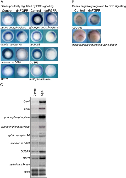 Figure 3. Validation of FGF target genes.(A) shows whole mount in situ hybridizations for genes positively regulated by FGF signaling at gastrula stage 10.5 in control embryos and embryos injected with 2 ng of dnFGFR1 mRNA. (B) shows the expression gene negatively regulated by FGF signaling in control embryos and embryos injected with 2 ng dnFGFR1 mRNA. All embryos are vegetal view with dorsal to the top. Non-uniform down regulation around the circumference of the blastopore is apparent in some embryos and is likely due to variability in the diffusion of injected dnFGFR mRNA. (C) is an RPA showing the expression at gastrula stage 10.5 of a number of genes in control animal cap explants and explants treated with FGF4 protein. 5 µg total RNA was used per hybridization. ODC is a loading control. |