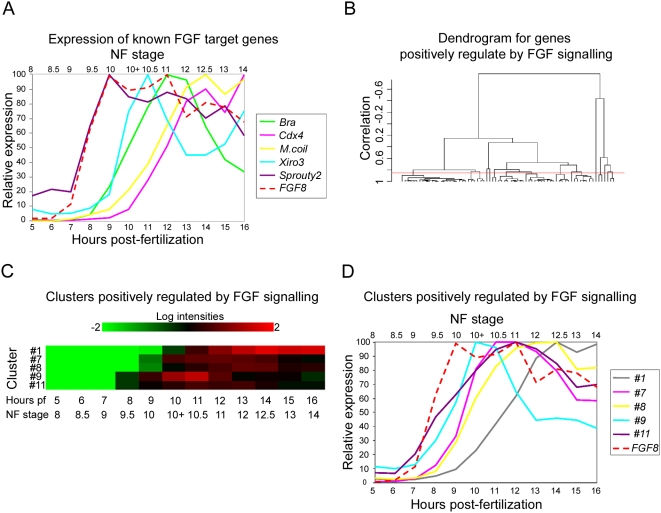 Figure 5. Cluster analysis of genes down regulated in response to FGF inhibition.(A) shows the temporal expression profiles of FGF8 (dashed line) and several known FGF target genes from blastula stage 8 until early neurula stage 14 (5 to 16 hours pf at 23°C). Profiles are derived from normalised microarray expression levels. Relative expression values are represented as percentages of the maximum expression value for each gene. (B) is a cluster dendrogram generated within BRB-ArrayTools for genes that are significantly down regulated in response to FGF inhibition i.e. positively regulated by FGF signaling. The red line indicates the level at which the dendrogram was cut, corresponding to a correlation coefficient of 0.85. (C) is a heat map of temporal expression for gene clusters positively regulated by FGF signalling. Only clusters containing ≥5 members are presented. Values at each time point from blastula stage 8 to early neurula stage 14 are derived from the mean of the expression levels for all the genes in each cluster. (D) shows the temporal expression profiles of FGF8 and gene clusters positively regulated by FGF signalling based upon the mean of the expression levels for all the genes in each cluster. |