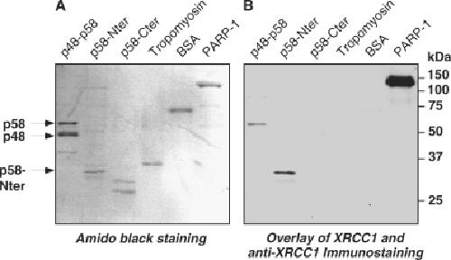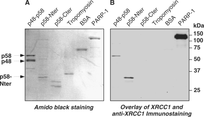 Figure 2. In vitro association of XRCC1 with the N-terminal domain of p58 assessed by far-western blot. Purified p48-His-tagged-p58, His-tagged p58 N-terminal (Nter) or C-terminal (Cter) domains expressed in E. coli were separated by SDS–PAGE and transferred onto a nitrocellulose membrane. Tropomyosin, BSA and PARP-1 were also included as internal negative and positive controls, respectively (A). The membrane was stained with amido black or incubated with purified XRCC1 and revealed with an anti-XRCC1 antibody (B). p58 domains were determined by partial tryptic digests and peptide analysis (Schlott and Nasheuer, unpublished data).