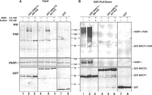 Figure 4. GST-XRCC1-BRCT1 overexpressed in HeLa cells triggers PAR synthesis and is poly(ADPribosyl)ated. HeLa cells overexpressing GST-hXRCC1-BRCT1 (amino acids 282–428, lanes 1–3), GST-hXRCC1-BRCT2 (amino acids 427–633, lanes 4–6) or GST (lanes 7, 8) were either untreated (lanes 1, 4 and 7) or treated with 2.5 mM MMS for 30 min (lanes 2, 5 and 8). Where indicated, cells were pre-incubated for 2 h with 100 nM of the PARP inhibitor Ku-0058948 (lanes 3 and 6). (A) Inputs corresponding to 2% of each lysates. Proteins were analyzed by GST pull down and western blot (B) using successively the anti-PAR, anti-PARP-1 and anti-GST antibodies.