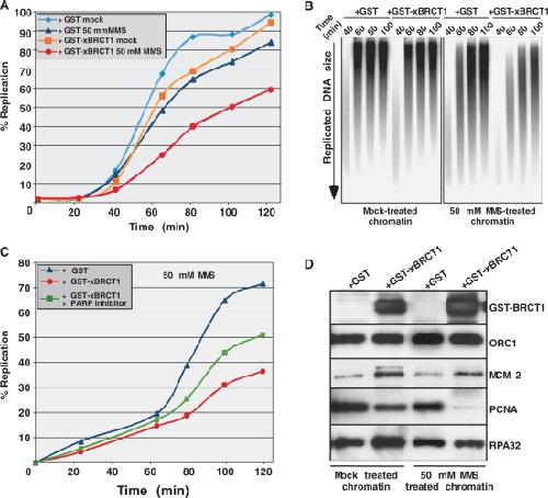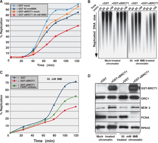 Figure 6. xXRCC1-BRCT1 inhibits the initiation of DNA synthesis in Xenopus egg extracts. (A) Kinetics of replication of either mock- or MMS-treated sperm chromatin after the addition of either purified GST or GST-xXRCC1-BRCT1 to egg extracts. (B) Size of replication products synthesized in (A) at different times as determined by alkaline gel electrophoresis and autoradiography. (C) Replication reactions were performed as in (A) in the presence of MMS or MMS and PARP inhibitor Ku-0058948 (green curve). (D) Western blot of chromatin-associated proteins after 60 min incubation in Xenopus extracts treated or not with MMS, in the presence of either GST or GST-xBRCT1.