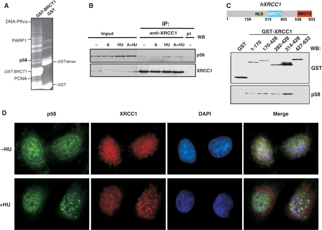Figure 1. Interaction between XRCC1 and p58 subunit of Pol α-primase. (A) Identification of proteins interacting with GST-XRCC1-BRCT1 by mass spectrometry. Sypro ruby stained gel after GST pull-down of HeLa cell extracts expressing either GST or GST-hXRCC1-BRCT1 fused proteins. (B) Identification of XRCC1 associated p58 by immunoprecipitation of XRCC1 from extracts of HeLa cells treated or not with aphidicolin (A: 5 μg/ml, 16 h) and with or without HU (4 mM, 4 h). Co-purifying p58 and immunoprecipitated XRCC1 were identified by western blot. Inputs represent 5% of the total proteins used in immunoprecipitation (pi: pre immune serum). (C) GST pull-down of p58 with different GST-fused XRCC1 domains overexpressed in HeLa cells. A schematic drawing of XRCC1 domain structure is shown. (D) Indirect immunofluorescence microscopy showing co-localization of XRCC1 and p58 in HeLa cells treated (+ HU) or not (−HU) with 4 mM HU for 4 h.