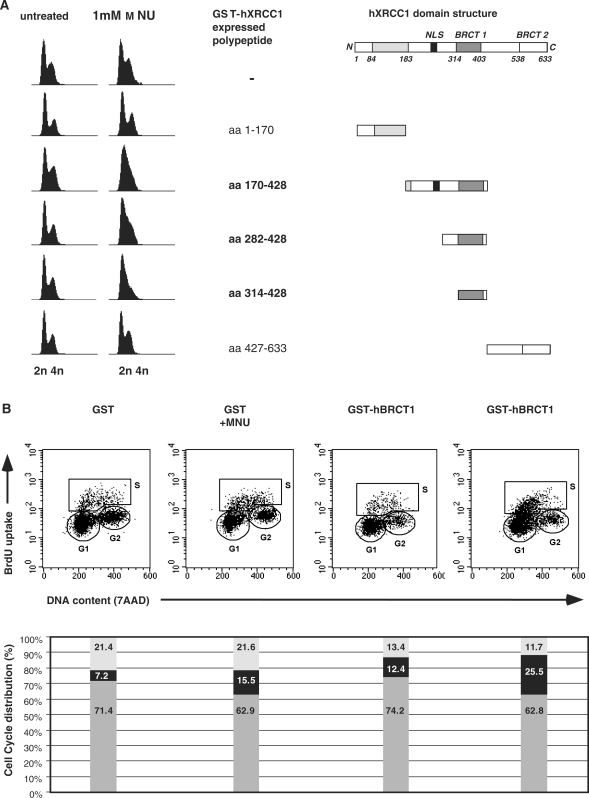 Figure 5. GST-hXRCC1-BRCT1 overexpressing cells accumulate in S phase following DNA damage. (A) Cell cycle analysis (right) of HeLa cells overexpressing GST-tagged fragments of hXRCC1 (schematically represented on the right), treated by 1 mM MNU and analyzed 20 h after. (B) Flow cytometry profiles of BrdU incorporation (DNA synthesis) versus DNA content (7AAD fluorescence) of HeLa cells overexpressing either GST alone or GST-hXRCC1-BRCT1 20 h after treatment or not with 1 mM MNU.