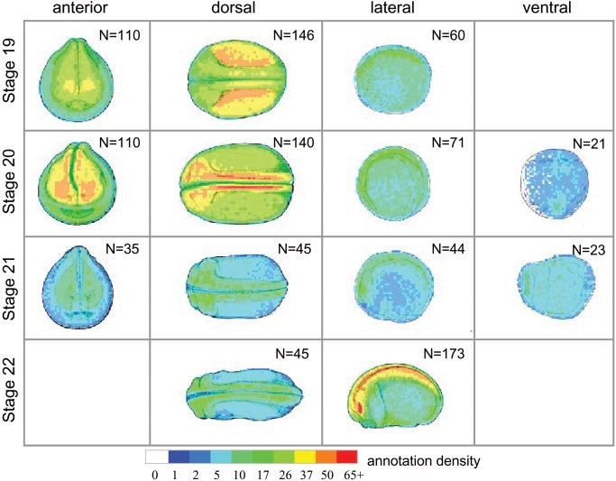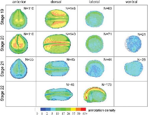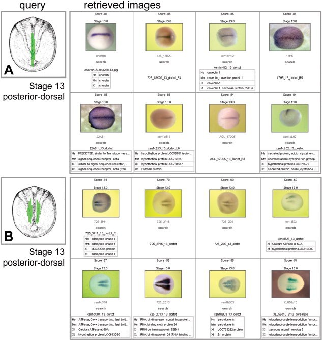 The precise localization of gene expression within the developing embryo, and how it changes over time, is one of the most important sources of information for elucidating gene function. As a searchable resource, this information has up until now been largely inaccessible to the Xenopus community. Here, we present a new database of Xenopus gene expression patterns, queryable by specific location or region in the embryo. Pattern matching can be driven either from an existing in situ image, or from a user-defined pattern based on development stage schematic diagrams. The data are derived from the work of a group of 21 Xenopus researchers over a period of 4 days. We used a novel, rapid manual annotation tool, XenMARK, which exploits the ability of the human brain to make the necessary distortions in transferring data from the in situ images to the standard schematic geometry. Developmental Dynamics 238:1379-1388, 2009. (c) 2009 Wiley-Liss, Inc.
