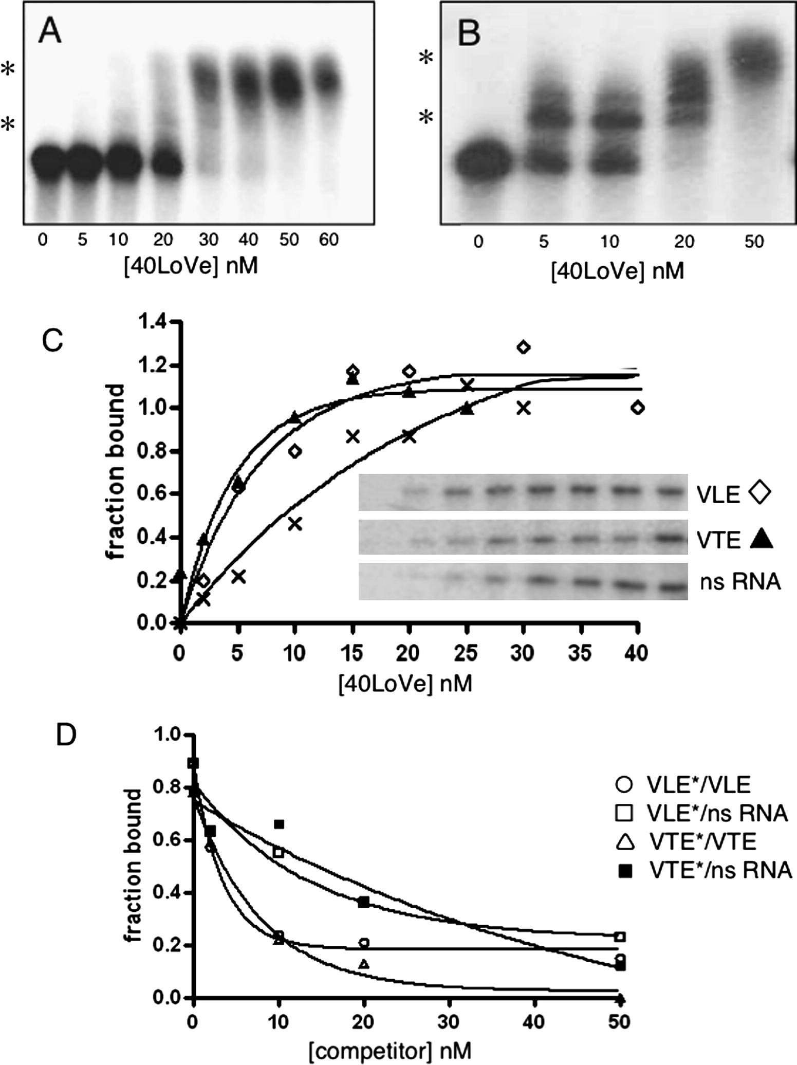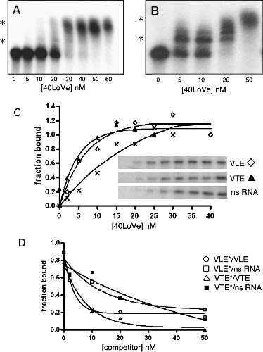 RNA binding activity of 40LoVe. The indicated concentration of 40LoVe was incubated with 2 nM internally radiolabeled VLE RNA (A) or VTE RNA (B). Samples were analyzed by electrophoresis on nondenaturing polyacrylamide gels. Asterisks mark the position of observed RNP complexes. (C) Binding assays were carried out in the same conditions with VLE, VTE, or nonspecific (ns) RNA. After crosslinking by UV irradiation and digestion with ribonucleases, the samples were analyzed by SDS–PAGE followed by autoradiography to detect radiolabeled protein (insert). Quantification of the autoradiograph using ImageJ software was used to construct binding isotherms. (D) Competition assays contained 10 nM 40LoVe and 2 nM radiolabeled VLE or VTE RNA and the indicated amount of unlabeled competitor RNA. Samples were crosslinked by UV irradiation, digested with ribonucleases, and then analyzed by SDS–PAGE/autoradiography. Radiolabeled VLE RNA competed against unlabeled VLE (○) or nonspecific (□) RNA; radiolabeled VTE RNA competed against unlabeled VTE (△) or nonspecific (■) RNA.