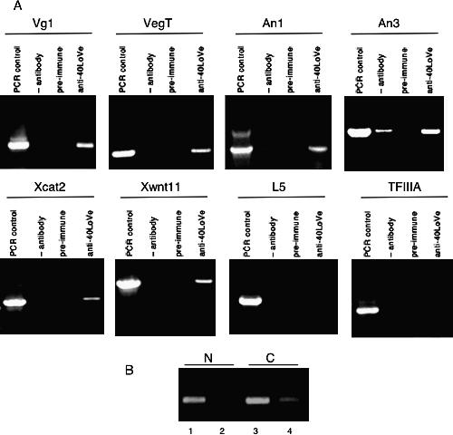 40LoVe is associated with localized RNAs in vivo. (A) 40LoVe was immunoprecipitated from whole cell extract prepared from stage III/IV oocytes. Associated RNA was reverse transcribed into cDNA and amplified by PCR using gene-specific primers (denoted by the bars above the relevant lanes) to test for the presence of the indicated mRNA. A standard was generated using total oocyte RNA as the template for RT-PCR (PCR control). Control assays included precipitation with protein A–Sepharose resin alone (–antibody) and resin adsorbed with pre-immune serum. (B) Stage II oocytes were manually separated into nuclear (N) and cytoplasmic (C) fractions. Extract from each was immunoprecipitated with protein A–Sepharose resin absorbed with affinity-purified antibody to 40LoVe (lanes 1 and 3) or preimmune serum (lanes 2 and 4). The presence of Vg1 mRNA was detected by RT-PCR.