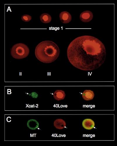 Distribution of 40LoVe during oogenesis. (A) Staged albino oocytes were fixed, incubated with an affinity purified antibody against 40LoVe, and visualized (10× objective) using a secondary antibody conjugated to AlexaFluor-568. The oocytes are orientated with the animal pole at the upper right. (B) Stage I oocytes were used for whole-mount in situ hybridization with an antisense Xcat-2 RNA probe labeled with AlexaFluor-488-5-UTP. This was followed by immunocytochemical analysis with 40LoVe antibody. An optical confocal section was viewed in the green channel (left) to detect Xcat-2 mRNA or in the red channel (middle) to detect 40LoVe. A merge of the two images (right) demonstrates that the cytoplasmic Xcat-2 mRNA (mitochondrial cloud) is in the region from which 40LoVe is excluded. (C) Immunocytochemistry was used to label the distribution of 40LoVe in stage I oocytes, followed by staining with MitoTracker Green (MT), which stains mitochondria. The mitochondria were viewed in the green (left) and 40LoVe in the red (middle) channels, respectively. The merged image (right) shows that 40LoVe is excluded from the mitochondrial cloud.