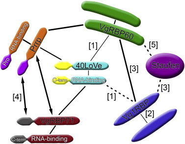Summary of protein–protein interactions in the Vg1 localization RNP complex. The weight of the lines indicates the apparent strength of the protein–protein interaction (in two-hybrid assays only), with thicker lines representing stronger contacts. Single-headed arrows indicate that the protein at the tail interacts with the specific region of the protein located at the head. Double-headed arrows indicate that the specific regions of the proteins interact with each other. Dashed lines represent reported interactions that may be indirect. Numbers refer to the following citations: [1] Czaplinski and Mattaj, 2006; [2] Git and Standart, 2002; [3] Kress et al., 2004; [4] Kroll et al., 2002; [5] Yoon and Mowry, 2004.