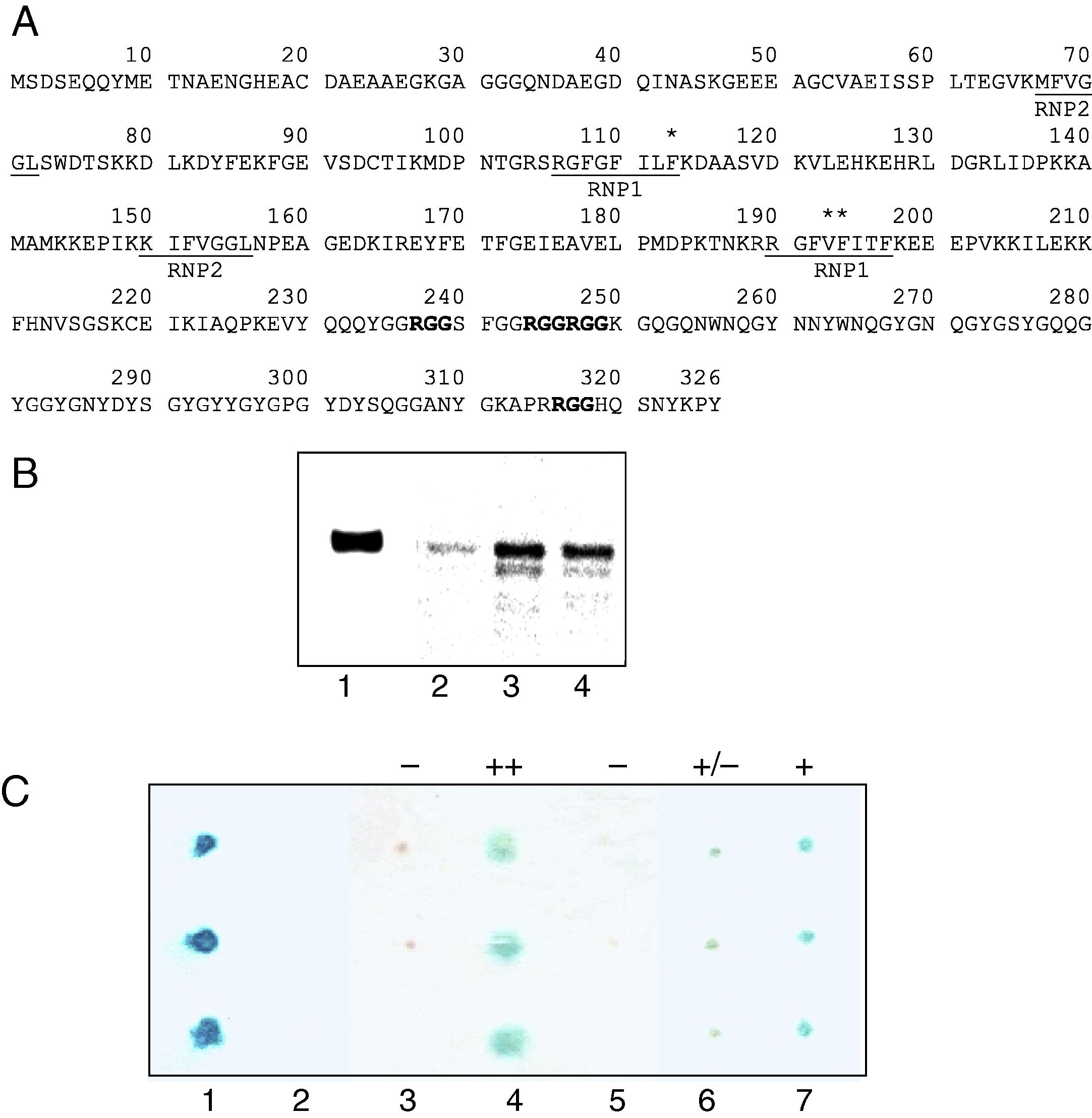 Prrp interacts with 40LoVe. (A) The predicted amino acid sequence of a 40LoVe paralog identified in the yeast two-hybrid screen. RNP1 and RNP2 motifs within the RNP domains are underlined. The individual RGG motifs are shown in bold. The phenylalanine at position 113 (*) marks the first amino acid present in the longest partial clone of 40LoVe retrieved from the two-hybrid screen. The valine at position 193 (**) is the first amino acid present in the shortest partial clone. The entire nucleotide sequence, including flanking UTRs, can be found at DDBJ/EMBL/GenBank Accession No. EU003449. (B) Co-precipitation of Prrp and 40LoVe. 40LoVe fused to maltose binding protein was synthesized in E. coli S30 extract and [35S]-labeled Prrp in rabbit reticulocyte lysate. After incubation for 4 h at 4 °C, amylose beads were pelleted, washed, and analyzed by SDSâPAGE/autoradiography. Lane 1, input Prrp; lane 2, amylose beads incubated with Prrp only; lane 3, beads incubated with Prrp and MBP-40LoVe; lane 4, beads incubated with Prrp, MBP-40LoVe and (1 μg) VLE RNA. (C) Colony lift filter assays used to characterize interactions between Prrp and 40LoVe. Each column represents three independently selected colonies. 1, positive control (p53/T antigen); 2, negative control (LamC/T antigen); 3, Prrp and full-length 40LoVe; 4, Prrp and 40LoVeδN (amino acids 113â326); 5, proline rich domain of Prrp (amino acids 242â360) and 40LoVeδN; 6, the RNA-binding domain of Prrp (aa 1â251) and full-length 40LoVe; 7, the RNA-binding domain of Prrp and 40LoVeδN. The apparent strengths of the interactions are labeled above the columns, and were scored as: âââ no interaction; â±â weak interaction; â+â interaction; and â++â strong interaction.