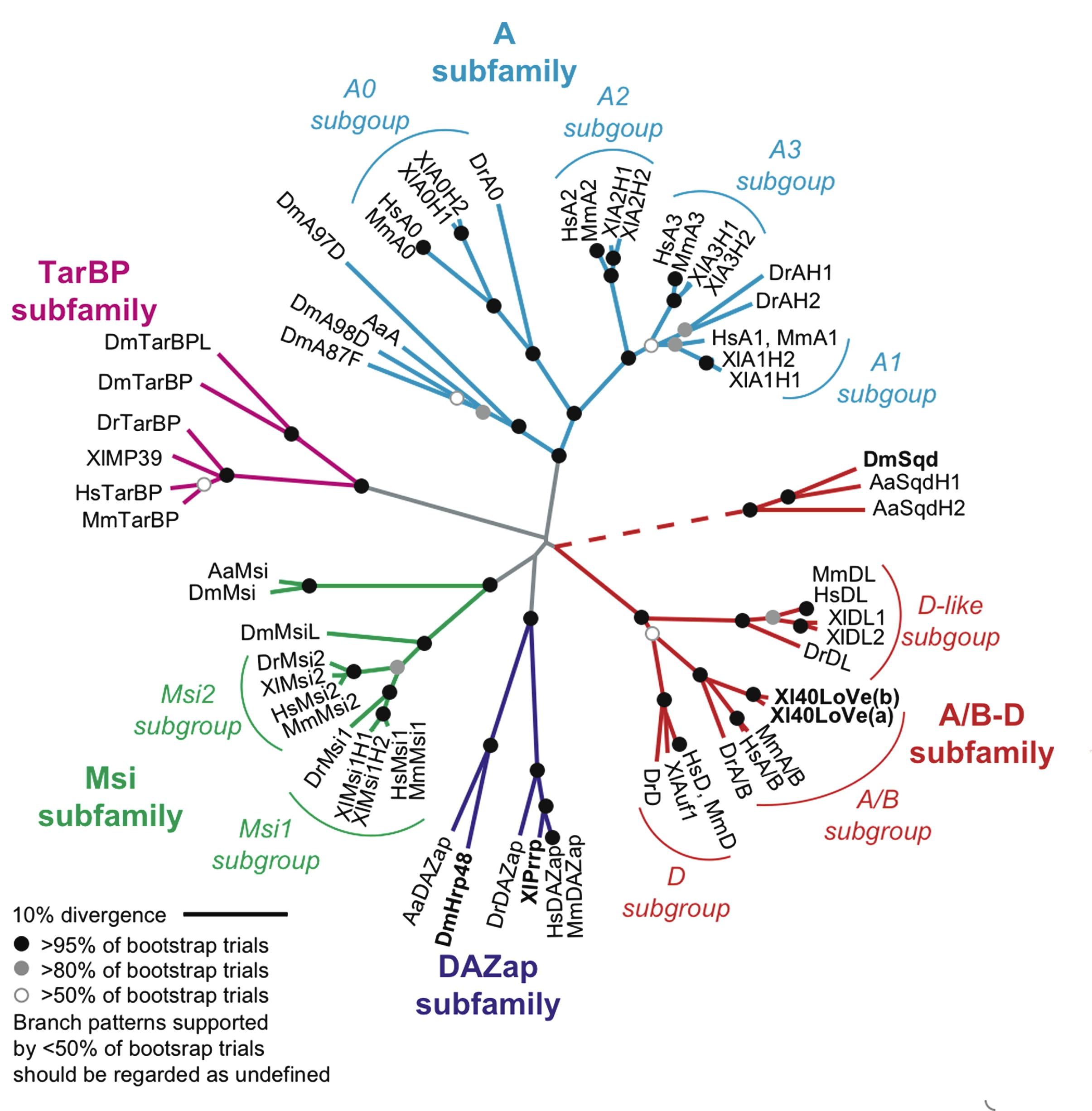 Phylogenetic analysis of selected 2×RBD hnRNP proteins. The unrooted phylogenetic tree (neighbor joining as implemented by ClustalX, 100 bootstraps) shows the relationships between Xenopus 40LoVe (both paralogs) and other members of the family of 2×RBD hnRNP proteins (using the conserved RNA binding domain region). This analysis indicates that 40LoVe is a member of the A/B subgroup of the A/B-D subfamily and Prrp is a member of the DAZap subfamily. The line leading to the Squid (Sqd) proteins is dashed to indicate that bootstrap support for the grouping is very weak. Protein names are preceded by a two-letter abbreviation of the source organism (Xl: Xenopus laevis; Hs: Homo sapiens; Mm: Mus musculus; Dr: Danio rerio; Dm: Drosophila melanogaster; Aa: Aedes aegypti). For accession numbers, full protein names, and additional information, see Supplementary material, Table 1. Note that the family of related 2×RBD hnRNP proteins contains additional organism-specific sequences and conserved subfamilies.