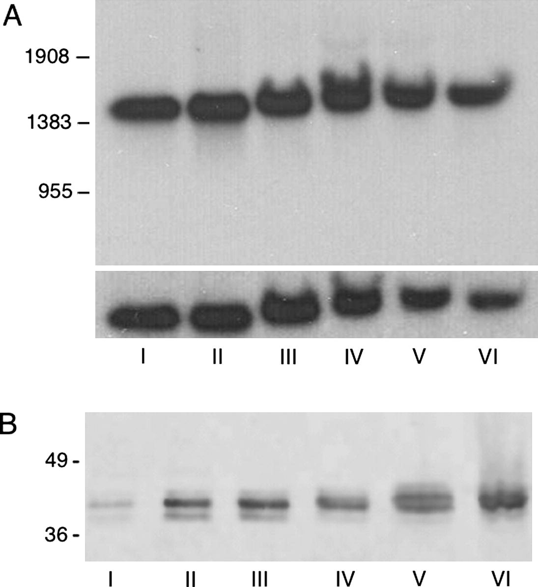 Temporal expression of 40LoVe. (A) Oocytes were separated into the six stages (I–VI) defined by (Dumont, 1972) and total RNA isolated for Northern blot analysis. Each lane contains 12 oocyte equivalents of RNA. The positions of the RNA size standards (nt) are indicated. The lower panel is GAPDH mRNA, which was used as a loading control. (B) Staged oocytes were homogenized and two oocyte equivalents loaded per lane in a Western blot assay. The primary antibody is affinity purified rabbit antibody against full-length 40LoVe. Molecular mass standards (kDa) are indicated.