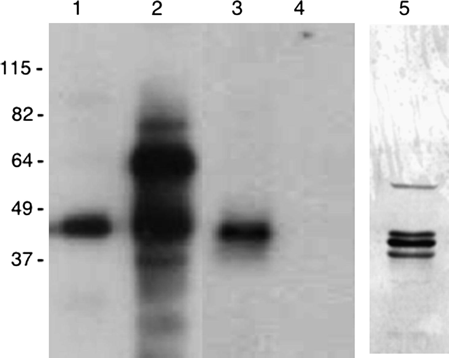 40LoVe corresponds to crosslinked protein p40. Internally radiolabeled VLE RNA was used in UV crosslinking assays with (lane 1) purified his-tagged 40LoVe, (lane 2) extract prepared from early stage oocytes, (lane 3) protein immunoprecipitated from extract following crosslinking and digestion with ribonucleases, (lane 4) precipitation with protein AâSepharose beads alone. The crosslinked extract was also analyzed by Western blot using antibody to 40LoVe (lane 5).