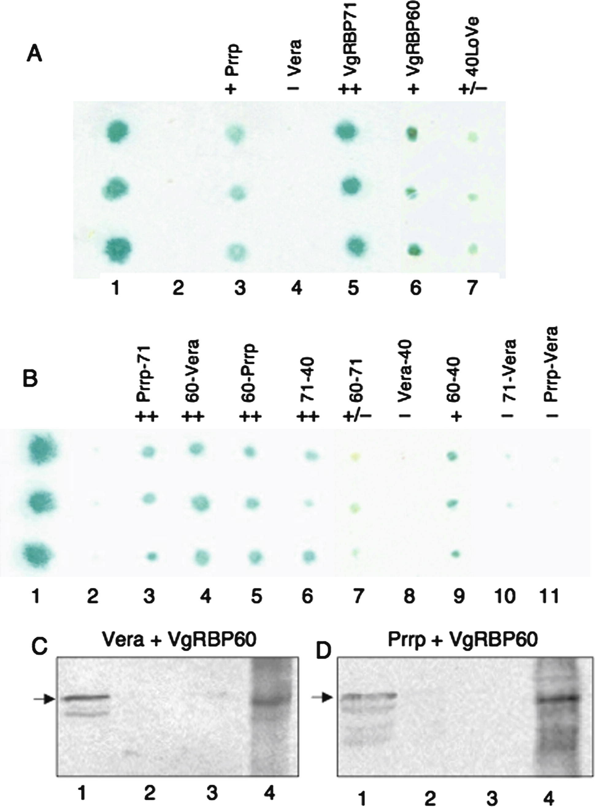 Protein–protein interactions between VLE-binding proteins. Colony lift filter assays were used to measure the interactions between the indicated bait-prey combinations. (A) Self-association. Column 1, positive control (p53/T antigen); 2, negative control (LamC/T antigen); 3, Prrp; 4, Vg1RBP/Vera; 5, VgRBP71; 6, VgRBP60; 7, 40LoVe. (B) Heterodimerization. Column 1, positive control (p53/T antigen); 2, negative control (LamC/T antigen); 3, Prrp-VgRBP71; 4, VgRBP60-Vg1RBP/Vera; 5, VgRBP60-Prrp; 6, VgRBP71-40LoVe; 7, VgRBP60-VgRBP71; 8, Vg1RBP/Vera-40LoVe; 9, VgRBP60-40LoVe; 10, VgRBP71-Vg1RBP/Vera; 11, Prrp-Vg1RBP/Vera. Co-immunoprecipitation assays. (C) Lane 1, [35S] VgRBP60 was incubated with Vg1RBP/Vera tagged with an HA epitope. The latter protein was retrieved with protein A–Sepharose beads adsorbed with HA antibody. The precipitated proteins were analyzed by SDS–PAGE/autoradiography; lane 2, control with no Vg1RBP/Vera; lane 3, control with no antibody; lane 4, input [35S] VgRBP60. (D) Lane 1, [35S] VgRBP60 incubated with Prrp tagged with an HA epitope, lane 2, control with no Prrp; lane 3, control with no antibody; lane 4, input [35S] VgRBP60. Arrowheads indicate the position of VgRBP60.