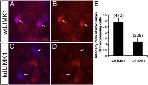 Fig. 4. wtLIMK1 increases the phosphorylation of cofilin. Stage 27 embryos were electroporated with GFP and either wtLIMK1-MT or kdLIMK1-MT, fixed at stage 37/38, cryostat sectioned and immunolabelled for P-cofilin1. (A, C) Merged images of myc-expressing diencephalic cells in blue (arrows) and P-cofilin1 expression in red, for wtLIMK1- (A) and kdLIMK1-electroporated (C) embryos. The matching images of P-cofilin expression alone are also shown for each condition (B: wtLIMK1, D: kdLIMK1). Scale bar is 10 μm. The intensity of P-cofilin1 expression in myc+ and mycâ GFP-expressing cells was scored in a blinded fashion on a scale of 0â3. (E) Graph showing the ratio of the average P-cofilin1 intensity between myc+ and mycâ GFP-expressing cells for each condition. Only for wtLIMK1-expressing cells was there an increase in P-cofilin1 expression in the myc+ cells compared to the mycâ cells. |