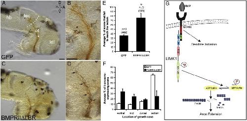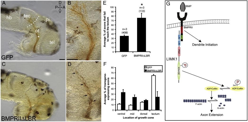 Fig. 9. Blocking the interaction between BMPRII and LIMK1 disrupts RGC axon extension. (AâD) Lateral views of stage 40 wholemount Xenopus brains showing transgene-expressing RGC axons labelled in brown with α-GFP (A, B) or α-myc antibodies (C, D). The developing retinas of stage 27 Xenopus embryos were electroporated with plasmids encoding GFP alone (A, B) or GFP plus BMPRIIδLBR-MT (C, D). Embryos were fixed at stage 40 and their brains processed for wholemount immunochemistry. B and D are higher magnification views of the tracts shown in A and C. The majority of RGC axons expressing GFP alone have grown through the diencephalon, made a caudal turn in the mid-diencephalon () and innervated the optic tectum by stage 40 (dotted line shows the approximate anterior border of the optic tectum). Many of the axons expressing BMPRIIδLBR-MT fail to reach their target by stage 40, and their growth cones (arrows) can be detected at various locations within the optic tract. Scale bar in A is 50 μm for A, C. Scale bar in B is 50 μm for B, D. A, anterior; D, dorsal; hb, hindbrain; pi, pineal gland; P, Posterior; ot, optic tract; tec, tectum; tel, telencephalon; V, ventral. (E) Graph showing the percentage of axons expressing either GFP or GFP/BMPRIIδLBR that failed to reach the tectum at the time of fixation. n = the number of independent experiments and in brackets are the numbers of axons analyzed. Error bars are S.E.M. p < 0.05, paired Student's t-test. (F) Graph showing the distribution of transgene-expressing growth cones along the optic pathway, averaged over three experiments. The numbers reflect the average percentage of total transgene-expressing axons with growth cones in progressively more distal sections of the optic tract. n's are the same as in E. Error bars are S.E.M. (G) Schematic showing a proposed model for the pathways that act downstream of BMPR signalling in RGC dendrites and axons. An unknown signalling pathway functions in dendrites, while the LIMK pathway is active in axons. Too much or too little LIMK activity changes the balance of actin polymerizationâdepolymerization regulated by ADF/cofilin, and impairs RGC axon extension. |