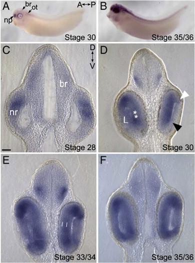 Fig. 1. Expression of limk1 in the developing Xenopus retina. (AâF) Xenopus embryos processed for wholemount in situ hybridization using antisense RNA probe for limk1. Whole embryos show a restricted pattern of limk1 expression. The eye, otic vesicle, areas of the brain and the nasal placodes all express limk1 mRNA at stage 30 (A). The pattern is maintained, but stronger in the eye and brain, at stage 35/36 (B). Transverse vibratome sections through labelled embryos shows the changing pattern of limk1 in the retina. At stage 28, the optic vesicle has not yet invaginated and there is a patch of limk1 expression in the dorsal/central retina that spans the width of the tissue (C). By stage 30, the optic cup is present and limk1 is expressed in the inner layers that will become the GCL () and the inner nuclear layer (INL) (not labelled) (D). Expression has spread to the dorsal ciliary marginal zone (CMZ; white arrowhead), but is still absent from the ventral CMZ (black arrowhead). Expression in the central retina has weakened slightly at stage 33/34 (E), while the dorsal CMZ, ventral retina and ventral CMZ show robust expression. The divisions between the emerging layers are shown by the white lines in E (from lens outward is GCL, INL, ONL). limk1 expression in RGCs begins to decrease at stage 35/36 (F), but is still strong in the INL and CMZ. A, anterior; br, brain; D, dorsal; e, eye; np, nasal placodes; nr, neural retina; ot, otic vesicle; P, posterior; V, ventral. Scale bar in C is 50 μm. |