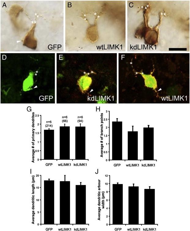 Fig. 5. Changes to LIMK1 activity do not alter RGC dendrite growth and branching. CS2-GFP was transfected alone as a control, or with CS2-wtLIMK1-MT or CS2-kdLIMK1-MT, into the retinal primordia of stage 19 Xenopus embryos. Embryos were fixed at stage 40, and either vibratome (AâC) or cryostat sectioned (DâF), and expression of the myc-tagged LIMK1 constructs was detected by anti-myc immunohistochemistry. GFP fluorescence fills the cell and allows for the analysis of cell morphology. Scale bar is 10 μm. Stars indicate branch points. (AâC) RGCs in retinal vibratome sections expressing GFP alone (A), wtLIMK1 (B), or kdLIMK1 (C). (DâF) RGCs in cryostat sections expressing GFP alone (D), GFP plus kdLIMK1 (E), or GFP plus wtLIMK1 (F). GFP fluorescence is shown in green, the myc-immunolabelling in red, and the merge in yellow. (GâJ) Graphs showing the quantification of the effects of wtLIMK1 and kdLIMK1 on RGC dendrite development. The average number of primary dendrites (G), number of branch points (H), total dendritic length (I), and width of the dendritic arbor (J) were similar in all conditions. n = the number of independent experiments, and in brackets are the numbers of cells analyzed for each condition. Error bars are S.E.M. p > 0.05, One Way ANOVA. |