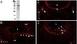 Fig. 2. LIMK is active in developing RGCs and their processes. (A) The P-LIMK antibody detects the phosphorylated, active forms of LIMK1/2 with the molecular weight of  65 kDa. (BâD) Transverse cryosections were immunolabelled with the antibody, and stacked optical slices presented. At stage 33/34, there is label in RGC axons, shown in a section (B) where RGC axons run along the vitreal surface of the retina (arrows) and in the optic nerve head, and in a section (C) that has captured part of the bilateral optic nerves before they enter the ventral diencephalon (white arrowheads). Labelling of the brain neuropil is also evident. At stage 37/38 (D), the optic fiber layer expression is still present (white arrows), but there is now more obvious labelling of the IPL. cmz, ciliary marginal zone; Di, diencephalon; D, dorsal; IPL, inner plexiform layer; L, lens; onh, optic nerve head; PE, pigment epithelium; RGCL, retinal ganglion cell layer; V, ventral. |