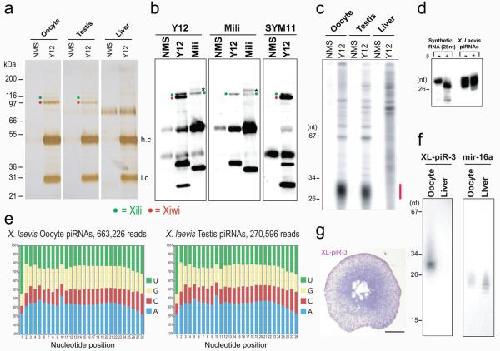 Figure 2. Xenopus laevis Piwi proteins with bound piRNAs are immunoprecipitated by Y12 and contain sDMAs(a) Protein immunoprecipitates from indicated X. laevis tissues; Xili and Xiwi were identified by mass spectrometry (Supplementary Table 3).(b) Immunoprecipitates from X. laevis oocytes were probed on Western blots with indicated antibodies. Band with asterisk is bovine IgG from tissue culture supernatant of anti-Mili hybridoma.(c) RNA-immunoprecipitations from X. laevis.(d) Periodate oxidation and β-elimination of X. laevis piRNAs isolated from Y12 immunoprecipitates.(e) Nucleotide composition of X. laevis piRNAs.(f) Northern blot for XL-piR-3(g) In situ hybridization for XL-piR-3 in X. laevis oocyte; bar = 100μm