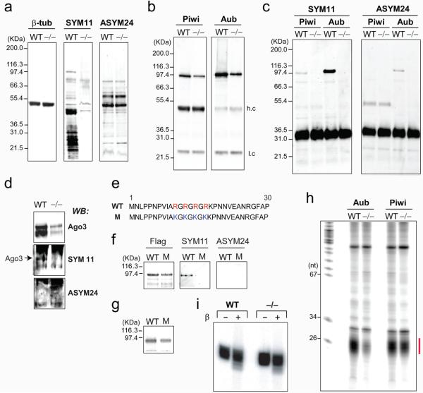 Figure 3. Drosophila PRMT5 (csul, dart5) is required for arginine methylation of Aub, Piwi and Ago3 proteins in ovaries(a) Western blots from wild-type (WT) or csul (dPRMT5) mutant (−/−) ovary. Piwi or Aub immunoprecipitates from ovary lysates were probed on western blots with anti-Piwi and anti-Aub antibody(b); or SYM11 and ASYM24 (c).(d) Ago3 immunoprecipitates from WT or csul mutant (−/−) ovary lysates were probed on Western blots (WB) with indicated antibodies.(e) Sequences of wild-type (WT) and mutant (M) Aub, where the four arginines that are substrates for methylation were substituted with lysines.(f) Anti-Flag immunoprecipitates of S2 cells stably transfected with WT or M Flag-Aub were probed on western blots with indicated antibodies.(g) Crosslinking of synthetic, radiolabeled piRNA to immunopurified WT or M Flag-Aub.(h) RNA immunoprecipitation.(i) Periodate oxidation and β-elimination of Drosophila piRNAs isolated from Piwi immunoprecipitates from wt or csul (−/−) mutant ovaries.