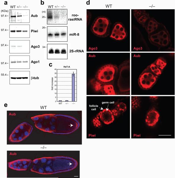 Figure 4. Reduction of Piwi proteins and piRNAs with accumulation of HeT-A retrotransposons and marked reduction of the Aub protein that localizes in the pole plasm, in the absence of dPRMT5 (csul) activity(a) Western blots of Drosophila ovary lysates from wild-type (wt), heterozygous (+/−) or homozygous (−/−) csul.(b) Northern blots of total RNA from indicated ovary lysates.(c) Fold changes of HeT-A retrotransposon transcripts in indicated ovaries assessed with qRT-PCR; n=3 and s.d. shown.(d) Ago 3, Aub and Piwi localization in indicated early stage egg chambers; bar = 15μm(e) Aub localization in indicated csul oocytes. Arrow indicates pole (germ) plasm; bar = 15μm