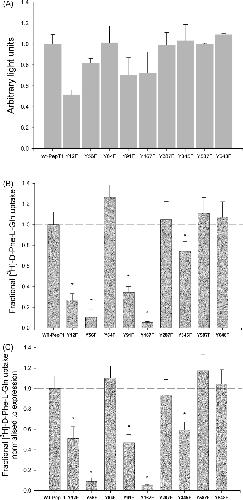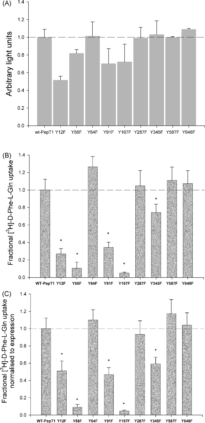 Fig. 1. (A) Surface expression quantification of all TMD tyrosine to phenylalanine mutants using luminometry against the FLAG epitope incorporated in each mutant. Wild type rPepT1-FLAG (wt-PepT1) surface expression was used as a positive control, and non-injected oocyte values were subtracted from all data as a negative control. Results are normalised to wild-type and expressed as mean ± SEM, n = 3 separate experiments, >20 oocytes per experiment. (B) Uptake of 0.4 μM [3H]-d-Phe-l-Gln into Xenopus oocytes expressing wild-type rPepT1 (wt-Pept1) or the individual tyrosine mutants. Non-injected control oocyte values have been subtracted from the data. Each data point is expressed as the mean ± SEM, *p < 0.05, n ≥ 3 separate experiments. The wild-type rPepT1 uptake corresponds to 342 ± 37 fmol peptide/(oocyte h). (C) Uptake of 0.4 μM [3H]-d-Phe-l-Gln into Xenopus oocytes expressing wild-type rPepT1 (wt-PepT1) or individual tyrosine mutants corrected for surface expression. Non-injected control oocyte values have been subtracted from the data. Note that adjustment has been made to normalize uptake to the level of protein expression for each mutant in order to express the functional effect of each mutation. Each data point is the mean ± SEM, *p < 0.05, n ≥ 3 separate experiments.