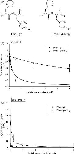 Fig. 4. (A) Chemical structures of Phe-Tyr-NH2 and its parent compound Phe-Tyr. (B and C) Ki determination of carboxyl-terminal amidated Phe-Tyr-NH2 and the parent compound Phe-Tyr by wild-type-PepT1 (B) and Y56F-rPepT1 mutant (C) at pHout 5.5. Uptake of 0.4 μM [3H]-d-Phe-l-Gln into oocytes was measured in the presence of increasing concentrations of Phe-Tyr or Phe-Tyr-NH2 at pHout 5.5. Lines represent best fit of the data to Michaelis–Menten kinetics for binding to a single site (Deves and Boyd, 1989). Each data point is the mean ± SEM of 5 oocytes, and the graphs are representative of n = 4 oocyte preparations.