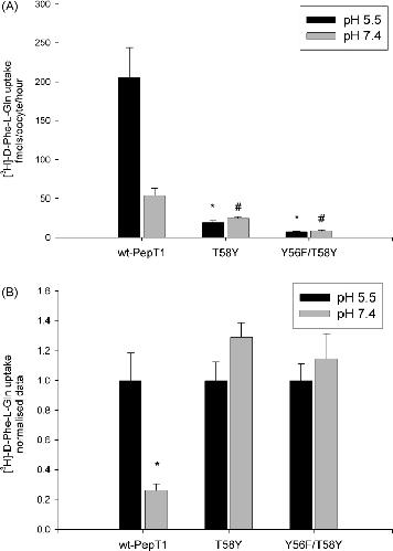 Fig. 5. (A) Uptake of [3H]-d-Phe-l-Gln in Xenopus oocytes expressing wild-type rPepT1 (wt-PepT1), the single T58F or the double Y56F/T58Y-rPepT1 mutants. *p < 0.01 versus wild-type uptake at pHout 5.5 (black bars) and #p < 0.01 versus wild-type uptake at pHout 7.4 (grey bars), Student's t-test, n = 3. (B) pH dependence of [3H]-d-Phe-l-Gln uptake normalised to the uptake of pHout 5.5 for each construct. pH dependence of uptake is seen only in the wild-type rPepT1 (*p < 0.01, Student's t-test, n = 3).