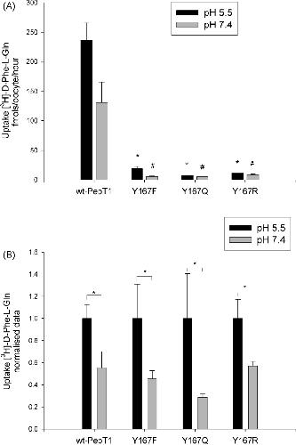 Fig. 7. (A) Uptake of [3H]-d-Phe-l-Gln in Xenopus oocytes expressing wild-type rPepT1 (wt-PepT1), Y167F-, Y167Q- or Y167R-rPepT1 mutants at pHout 5.5 and 7.4. Uptake is reduced by >90% as compared to the wild-type at both pHout 5.5 (black bars, *p < 0.001, Student's t-test, n > 3) and pHout 7.4 (grey bars, #p < 0.001, Student's t-test, n > 3). (B) pH dependence of [3H]-d-Phe-l-Gln uptake normalised to the uptake of pHout 5.5 for each construct. pH dependence of uptake is maintained in all Y167 mutants (*p < 0.05, Student's t-test, n > 3).