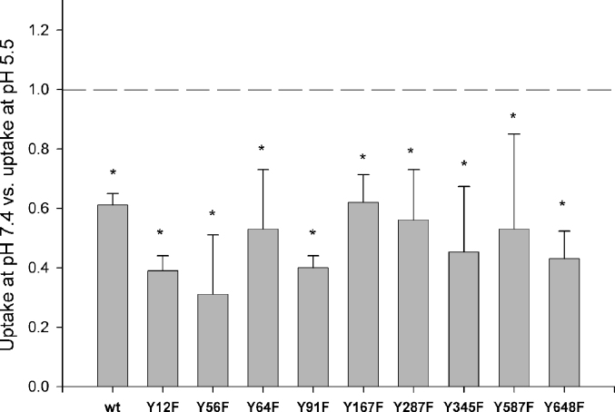 Fig. 2. Comparison of pH dependence of [3H]-d-Phe-l-Gln uptake by the wild-type rPepT1 (wt) and individual tyrosine mutants. Uptake of [3H]-d-Phe-l-Gln by oocytes was measured at extracellular pH 5.5 and pH 7.4 after one hour incubation. Values represent mean ± SEM for three separate oocyte preparations and are normalized to the uptake at pHout 5.5 for each construct, *p < 0.01, n = 3, Student's t-test compared to pHout 7.4.