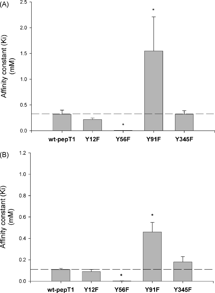 Fig. 3. Graphs show the affinity constants (Ki, mM) for the Y12F-, Y56F-, Y92F- and Y345F-rPepT1 mutants for both pHout 5.5 (A) and 7.4 (B). The uptake of 0.4 μM [3H]-d-Phe-l-Gln into oocytes was measured in the presence of increasing concentrations of the non-radioactive (cold) Gly-l-Gln dipeptide. Each Ki was calculated from the best fit of the data to Michaelis–Menten kinetics for binding to a single site (Deves and Boyd, 1989), *p < 0.05, n = 3, Student's t-test compared to wild-type.