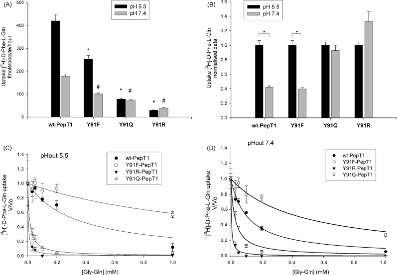 Fig. 6. (A) Uptake of [3H]-d-Phe-l-Gln in Xenopus oocytes expressing wild-type rPepT1 (wt-PepT1), Y91F-, Y91Q- or Y91R-PepT1. *p < 0.05 versus wild-type uptake at pHout 5.5 (black bars) and #p < 0.05 versus wild-type uptake at pHout 7.4 (grey bars), Student's t-test, n = 3). (B) pH dependence of [3H]-d-Phe-l-Gln uptake normalised to the uptake of pHout 5.5 for each construct. pH dependence of uptake is maintained only in the Y91F-rPepT1 mutant (*p < 0.01, Student's t-test, n = 3). (C and D) Ki determination of Gly-l-Gln against 0.4 μM [3H]-d-Phe-l-Gln uptake by wild-type rPepT1 (wt-PepT1) and the Y91F-, Y91Q- and Y91R-rPepT1 mutants at pHout 5.5 (C) and 7.4 (D). Lines represent best fit of the data to Michaelis–Menten kinetics for binding to a single site (Deves and Boyd, 1989). Each data point is the mean ± SEM of 5 oocytes, and the graphs are representative of n ≥ 2 oocyte preparations.
