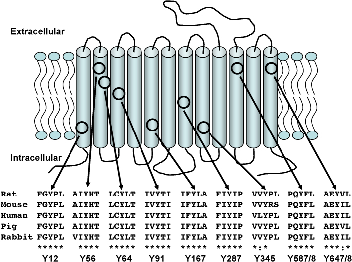 Fig. 8. Cartoon representation of rPepT1 to show the putative position of the transmembrane tyrosines (adapted from Fei et al., 1994).