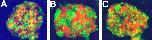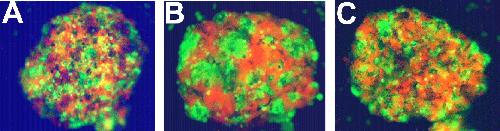 Fig. 4. Dissociation and reaggregation assay. Dissociated inner ectodermal cells from embryos injected with 15 ng of RDx were mixed with inner ectodermal cells from embryos injected with RNAs encoding eGFP (panel A) or eGFP and PAPC (panel B) or eGFP and PCNS (panel C). Reaggregated cells were cultured until sibling embryos reached stage 28. PCNS expression yielded essentially the same degree of segregation as eGFP alone, while PAPC-expressing cells (green) largely separated from non-expressing cells (red). Each sample replicated in quadruplicate with similar results.